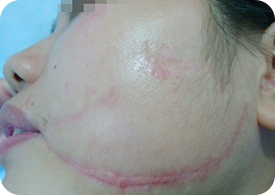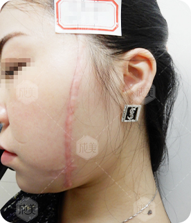 1年前该患者因为脸部遭受到意外受伤,因没做好疤痕预防,留下了一条显眼的疤痕。经我院治疗后,疤痕凸起部位已恢复平整,与周边正常肌肤非常接近。