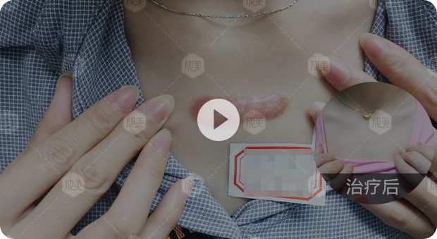 患者胸前疤痕疙瘩颜色红润,正处于增生期,我们通过强脉冲光等仪器抑制疤痕增生,再配合分解酶,消融异常增生的疤痕组织,最终使凸疤逐渐变平整。